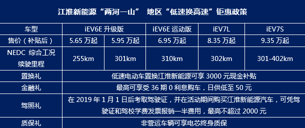 大河网讯 为了更好的普及新能源汽车,倡导绿色安全出行,江淮新能源近期面向“两河一山”(山东、河南、河北)地区的低速电动车主狂撒亿元红包,开展低速电动车置换专项活动,置换礼、金融礼、驾照礼、质保礼四重大礼助力低速电动车主品质升级、舒适升级、安全升级,安心又省钱!详情如下表所示。