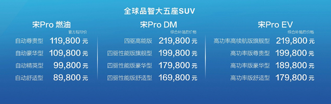大河网讯 7月11日,“全球品智大五座SUV”宋Pro在北京水立方赞放上市,新车集越级大五座空间、全擎全动力、众多智能黑科技于一身,为Pro时代中国主流家庭而来。燃油、双模、纯电三大动力,共计12款车型重磅登场,其中,宋Pro燃油官方指导价8.98万—11.98万元;宋Pro DM综合补贴后价格16.98万—21.98万元;宋ProEV综合补贴后价格17.98万—21.98万元。