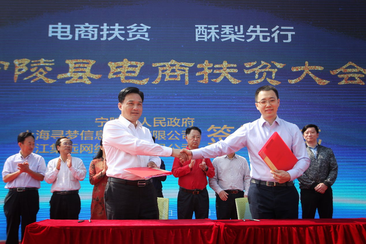 河南省商丘市宁陵县常务副县长侯公涛(左)与拼多多政府事务副总裁李源(右)签约