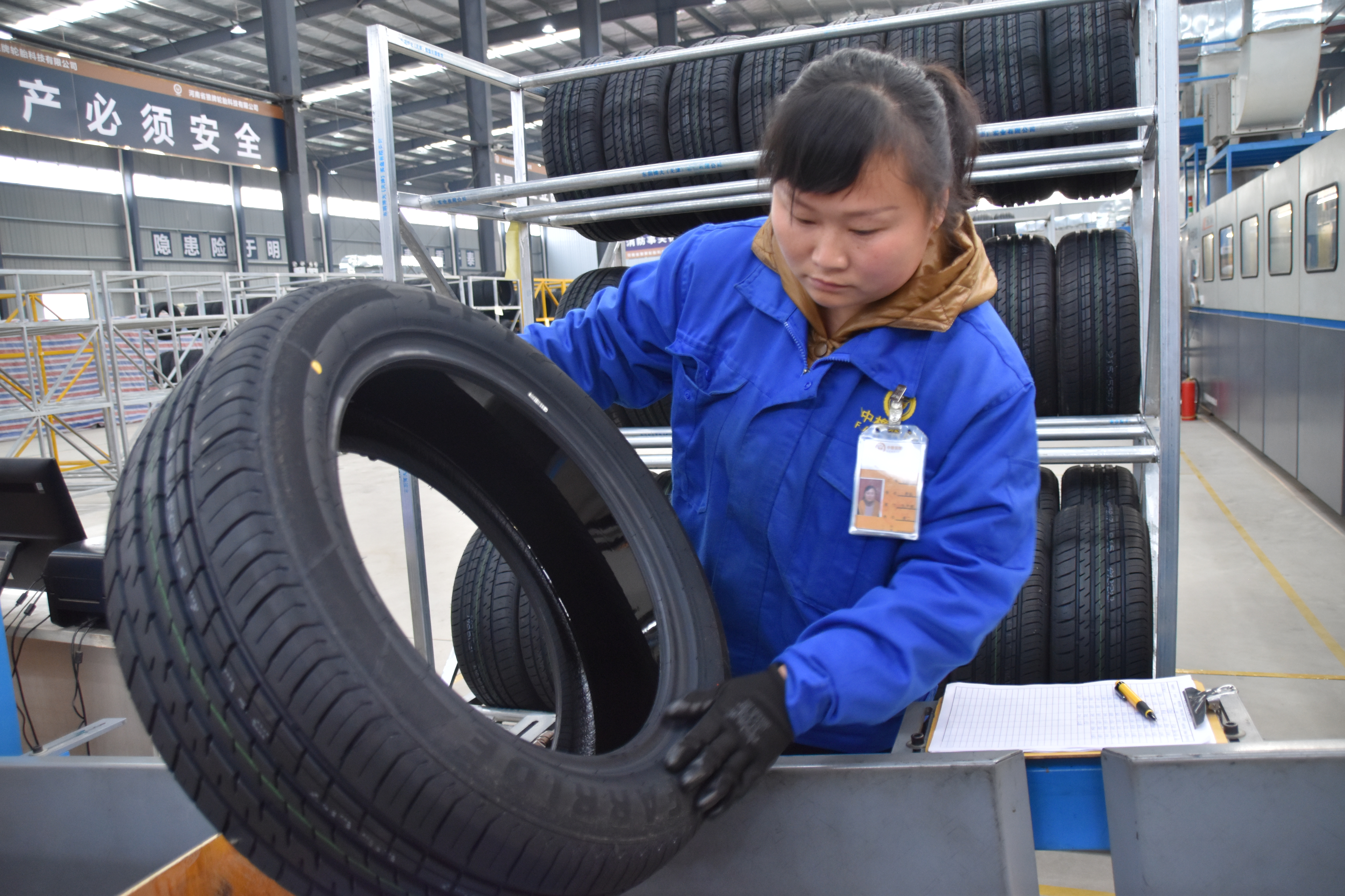 工人对轮胎进行质检