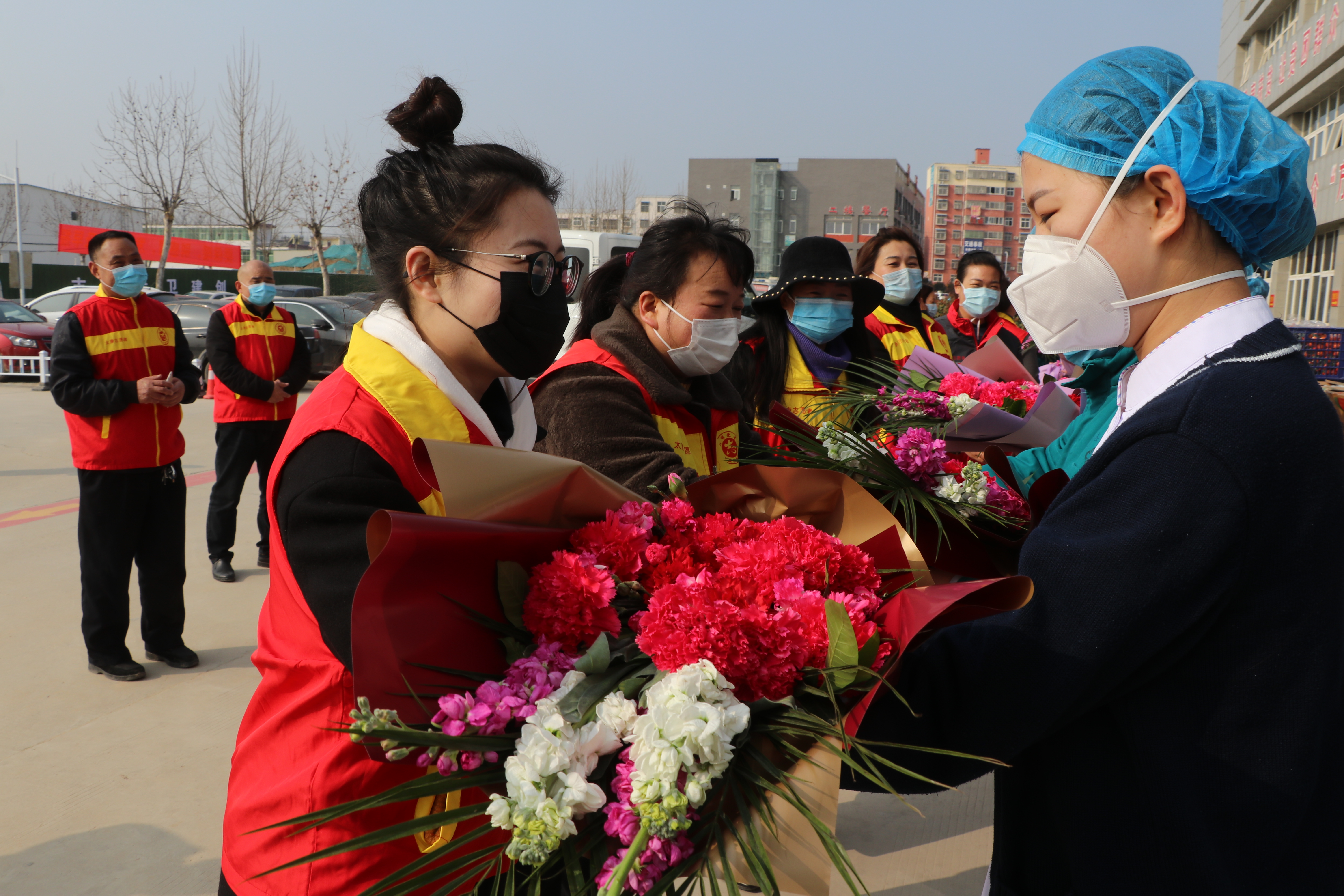 离开李宗富家,志愿者带着100多件水果、方便面等慰问品又来到县人民医院。在该院门诊大楼前,王勇、崔海英、朱业德、朱峰等10名志愿者,将10束鲜花和锦旗献给医院发热门诊的医护人员,现场顿时响起热烈的掌声。“其实,作为一名医务工作者,守护群众的身体健康,这是我们的责任和使命,这都是我们医护人员应该做的。”太康县人民医院党委副书记书记张雪峰接过鲜花和锦旗,激动地说。