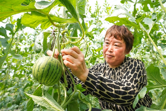 正是繁忙时节,洪爱玲从周边几个村子雇了20多名留守妇女干活,教给她们技术,工资日结。“从座瓜开始,有湿度、有温度长得很快,一天一个样,一个月就成熟了。现在俺也学会了啥时候栽培、怎样掰杈、一颗瓜秧能座几个瓜,将来俺家也发展小吊瓜种植!”“咱学的熟练了,将来还能当技术员。”大棚内,几名妇女正在干活,她们似乎正围绕西瓜产业做起了规划。