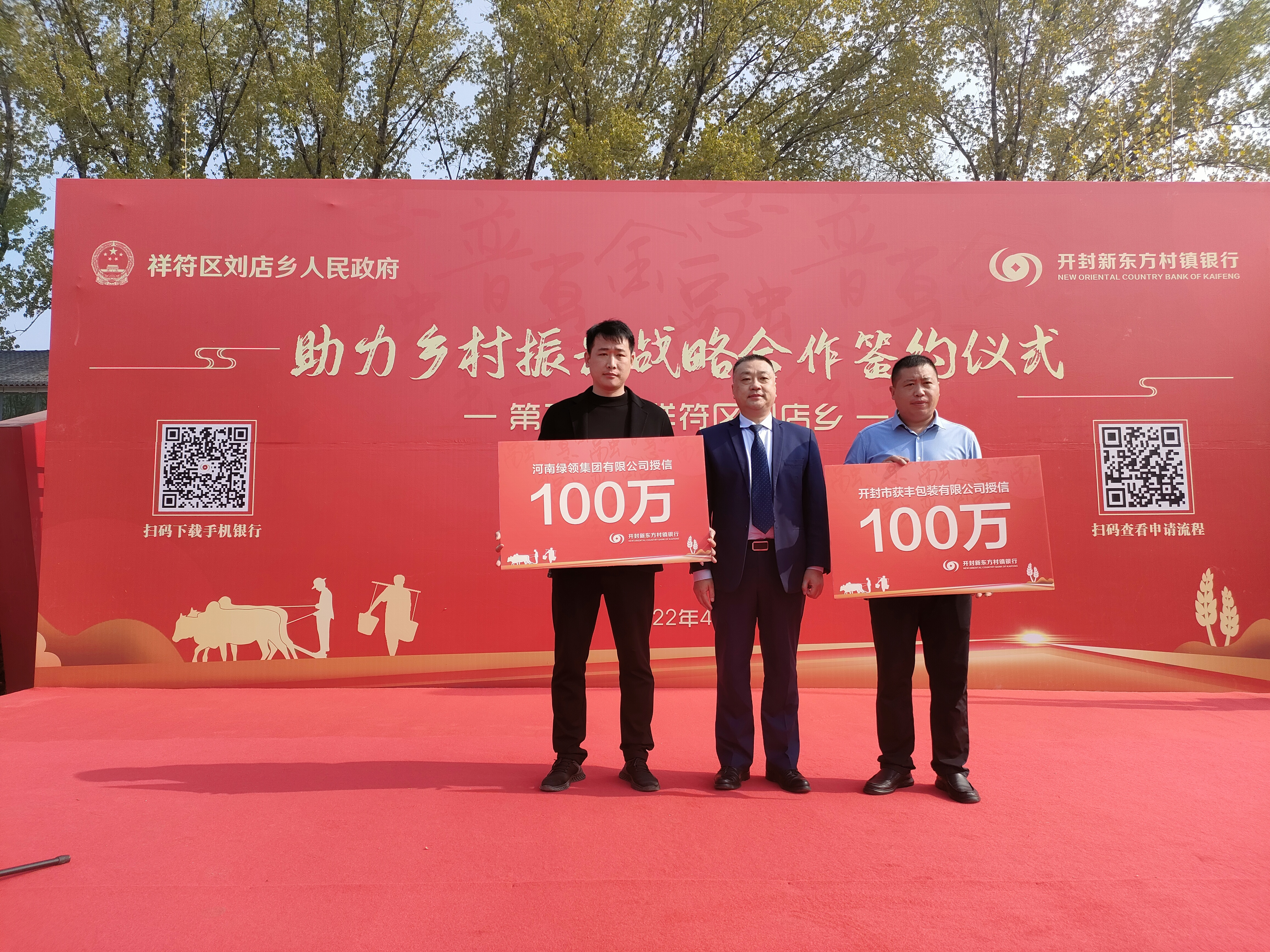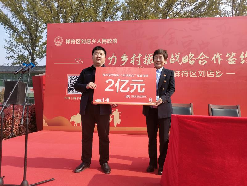 刘店乡党委副书记、乡长曹伟与开封新东方村镇银行党委书记、行长李小雷同志共同签署助力乡村振兴战略合作协议,并对刘店乡人民政府助力乡村振兴现场授信2亿元,庆荣太同志为开封市获丰包装有限公司、河南绿领集团有限公司授信各100万元。
