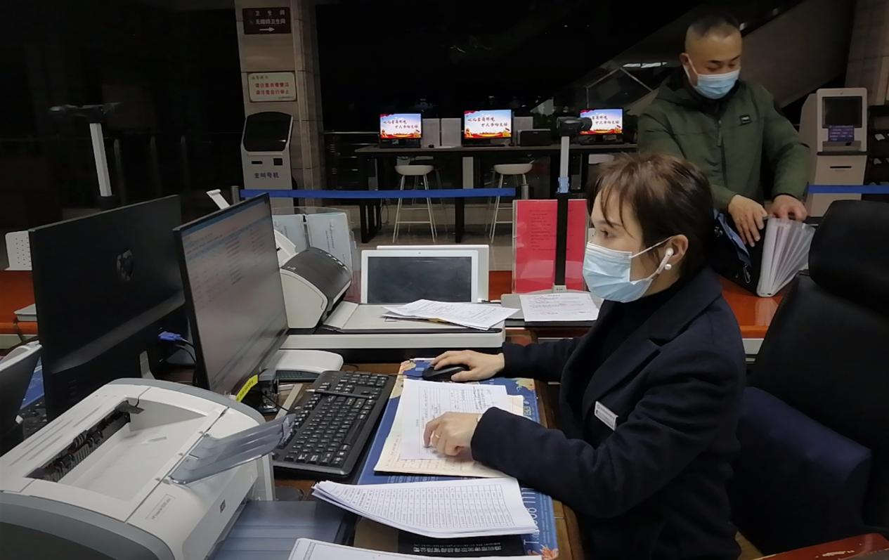 12月1日晚,光山县政务服务大厅不动产登记中心窗口工作人员正在加班为王先生办理业务 胡海波/摄