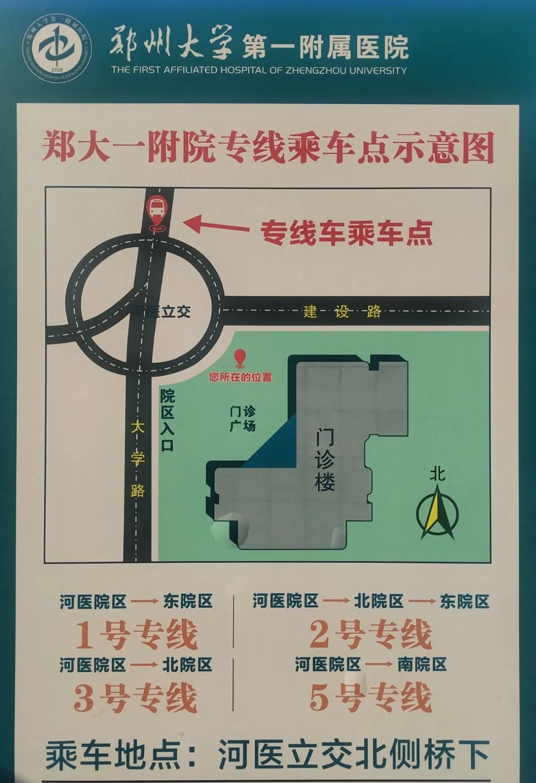 记者在现场看到,如需前往郑大一附院其他院区,河医立交桥北侧桥下还设置了专线乘车点:河医院区→东院区,乘1号专线;河医院区→北院区→东院区,乘2号专线;河医院区→北院区,乘3号专线;河医院区→南院区,乘5号专线。