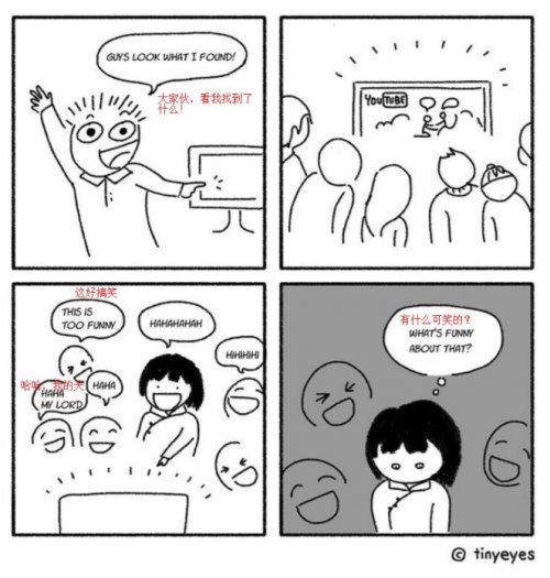 Siyu在国外呆了10年,分别在美国、英国、法国留学、旅行和工作过,在国外生活中,总遇到许多老外对中国充满好奇,但他们对中国的印象依旧停留在如“共产主义”、“污染严重”和“没有Facebook”上,虽然这些都是真实,但中国当代生活的方方面面很少被他们提及到。 于是Siyu 开始绘制 “tiny eyes” 漫画,希望通过日常生活来分享中国文化,她想把这些传递给那些对中国感兴趣的外国人们。在她的许多漫画中,她把中国文化与作西方文化进行对比。能从日常生活中更多的向大家分享中国文化。