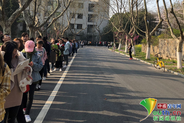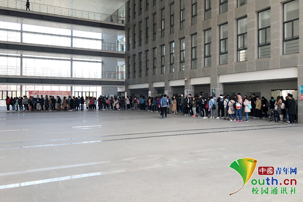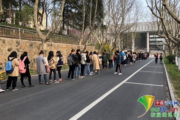 中国青年网北京4月4日电(记者 李华锡 通讯员 闫春旭)3月26日,为了能够领到图书馆发放书包柜钥匙和考研自修室座位号,早上6点多,南京大学金陵学院思源图书馆门口就排起了长队。记者看到,蜿蜒的队伍如长龙一样从该校图书馆门口一直延伸到远处的浦区,随着同学的不断加入,排队的人群仍在逐渐壮大中,队伍排到了800米,拐了五个弯。