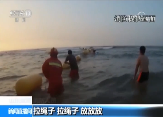 8月16日下午5点多,山东威海国际海水浴场,正在游泳冲浪的7人被困在海水中,其中有两名10岁女孩。消防人员赶到现场后发现,事发当时海浪较大,7人被困在离海岸较远的防鲨网,为安全起见,消防人员用安全绳在海水中搭起绳桥,携带救生衣进入海水中救人。