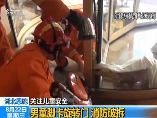 7月11日下午2点多,由于天气炎热,湖北恩施的张先生夫妇带着孩子在附近的一家酒店消暑纳凉。不料5岁的儿子在酒店旋转门处玩耍时右脚被卡进旋转门的缝隙里面了,经过多次尝试都没能拔出来。消防人员到场后迅速对旋转门进行破拆。