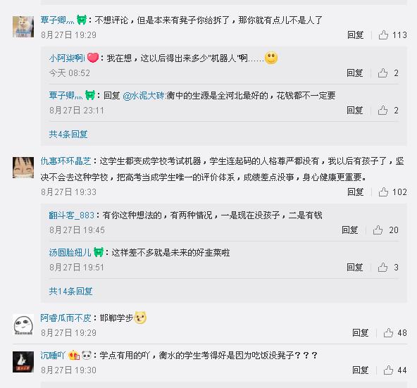 网友“仇惠环环晶芝”:学生都变成学校考试机器了,我以后有孩子了,坚决不会去这种学校,把高考当成学生唯一的评价体系,成绩差点没事,身心健康更重要。