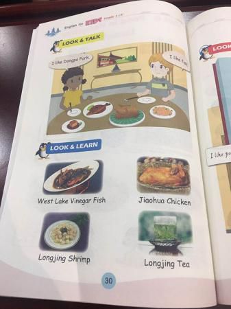 “DongPo Pork”(东坡肉)、“West Lake Vinegar Fish”(西湖醋鱼)……这个学期起,杭州85所小学试点在一年级开设英语课,作为地方课程,这些当地的传统名菜被编入教材《English for Kids》。