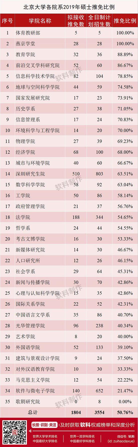 若具体到院系或专业,很多院系或专业的推免比例则要更高。以北京大学为例,体育教研部和燕京学堂的推免比例为100%。教育学院和前沿交叉学科研究院的推免比例分别为88.89%和86.67%。信息科学技术学院、地球与空间科学学院、国家发展研究院、历史学系等推免比例超过了70%。总体来看,北京大学的推免比例为50.76%,共有20个院系的推免比例超过了50%,其中不乏热门专业或北大的一流学科,这在无形中加大了统招考生的竞争激烈程度。