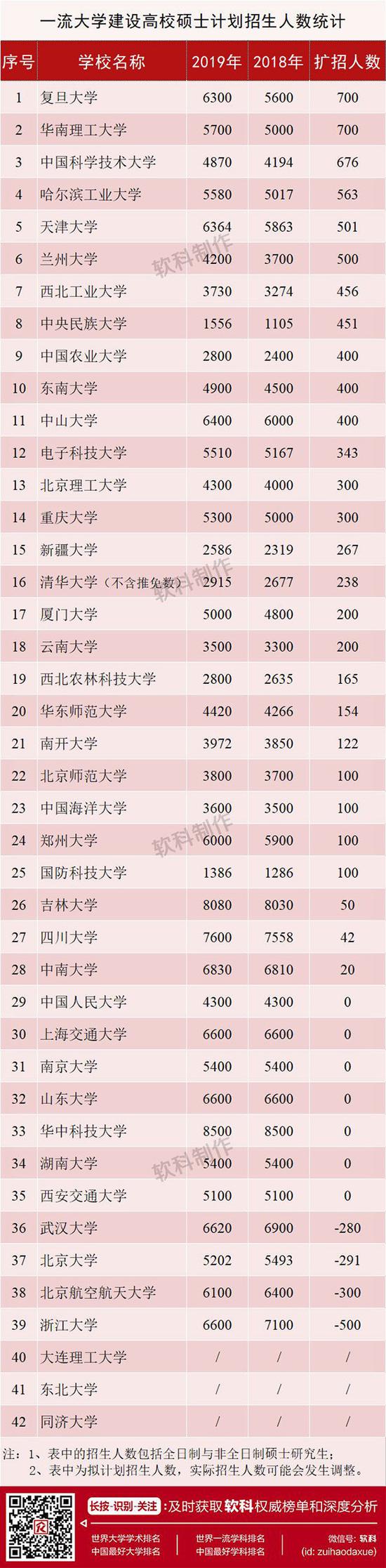 上文提到,不少考生选择考研是出于“名校情结”,那名校的硕士研究生扩招人数就更值得关注了。软科通过查找42所一流大学建设高校2018年和2019年的硕士研究生招生简章、招生计划、专业目录等资料,搜集到了其中39所一流大学建设高校近两年的计划招生人数。