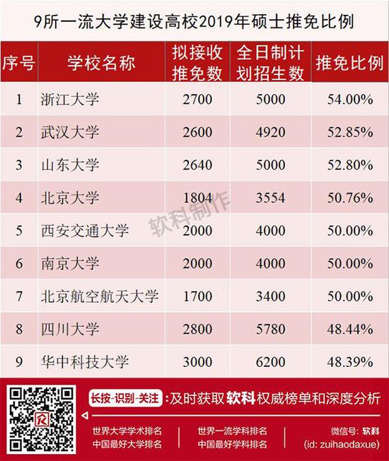 对于名校而言,推免更是成为了不可或缺的重要招生手段。上述39所一流大学建设高校中,有9所高校在2019年的硕士研究生招生简章中明确写出了拟接收推免数和全日制硕士生计划招生数。如下表所示,9所高校的推免比例均超过了40%,其中7所达到了50%以上。(注:推免比例=拟接收推免数/全日制计划招生数。)