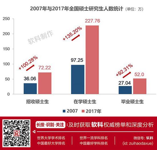 那么,在考研报名人数持续走高的同时,高校是否也在进行研究生扩招呢?教育部《2017年全国教育事业发展统计公报》显示,2017年研究生招生80.61万人,其中招收硕士生达72.22万人;在学研究生263.96万人,其中在学硕士生227.76万人;毕业研究生57.80万人,其中毕业硕士生52.0万人。对比2007的统计数据,招收硕士生人数增长了100.28%,在学硕士生人数增长率高达135.20%,毕业硕士生人数也增长了92.31%,三者几乎都实现了翻倍式增长。