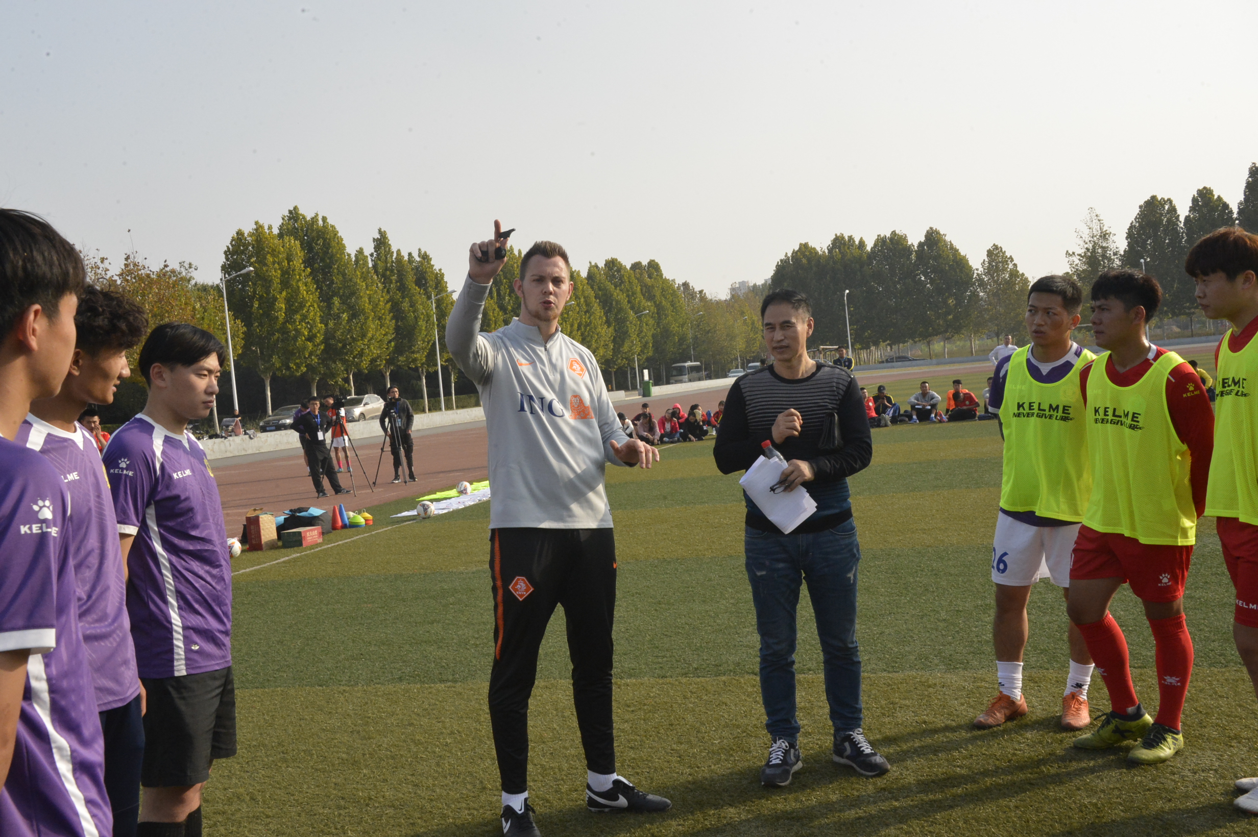 当天下午,荷兰国家队青训教练米歇尔•范德沃夫在河南师范大学东区足球场为河南师范大学运动训练专业学生进行现场教学。现场教学后,专家组前往新乡市凤凰山生态区,实地考察了新乡市申报的全国青少年校园足球改革试验区部分规划场地。