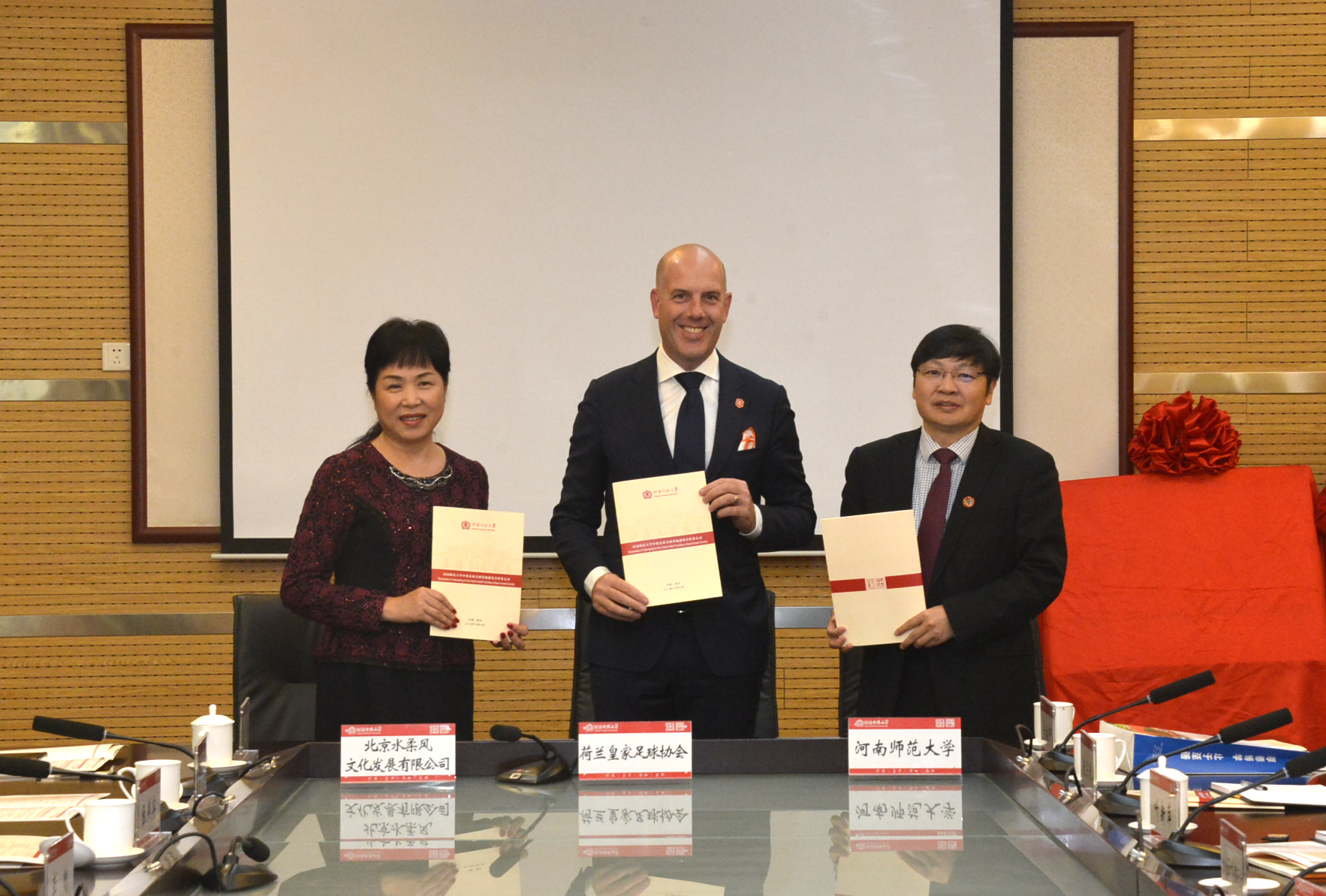 开幕式上,河南师范大学副校长李学志、荷兰皇家足球协会秘书长吉斯•德容、北京水柔风文化发展有限公司董事长叶新萍共同签署了中荷足球青训基地建设合作备忘录。教育部体卫艺司体卫处副处长樊泽民、河南师范大学党委书记赵国祥、吉斯•德容、河南省青少年校园足球工作领导小组办公室主任郭蔚蔚为河南师范大学国际足球教育学院揭牌。