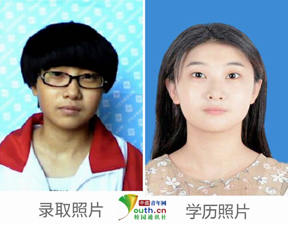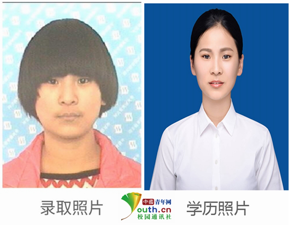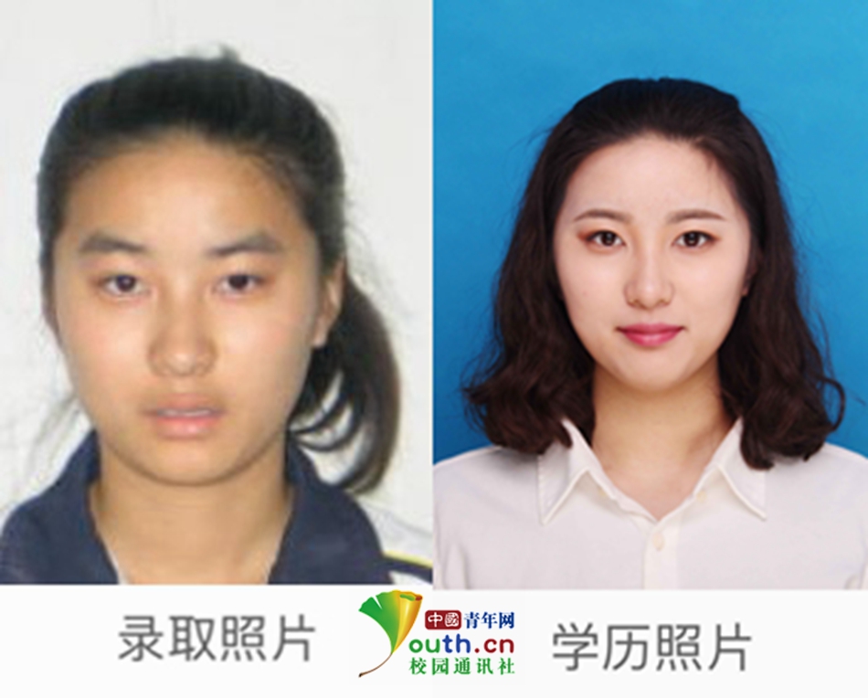 图为河北地质大学华信学院学生齐晓静的录取照和学历照。面对四年的变化,她说:“四年来,周围的同学都从我身上看到了很大的变化,从一头短头发到长发及腰,还努力护肤,肤色变白了两个度,一步步变得越来越女神。大学是个整容所,希望我能变成更好的自己。”本人供图