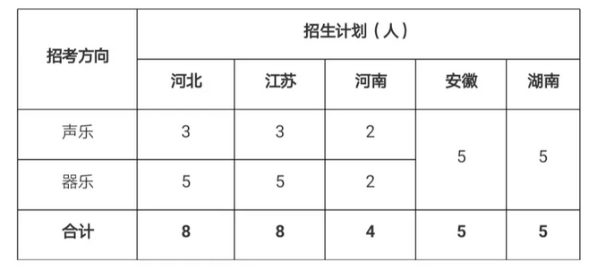 音乐学办学层次为本科,学制4年,2019年招生计划30人,含声乐和器乐,分省计划如下。