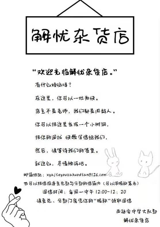 一石激起千层浪。从来只听说有烦恼可以找心理老师、“知心姐姐”咨询、倾诉,小伙伴们自己也能分享解决烦恼吗?这份提案在学校少代会上得到了广泛好评,最终也获得了校方认可。很快,从策划活动方案,到购买安装信箱,校园里建起了一个“西延安解忧杂货店”。这里的店长和店员,都是学生自己。同学们匿名写的烦恼信件,由店员定时收取、阅读、回信。