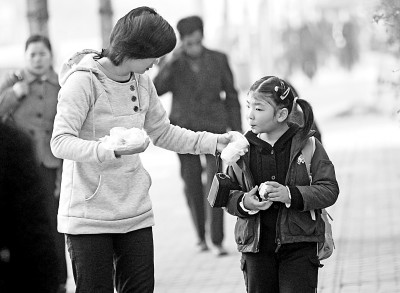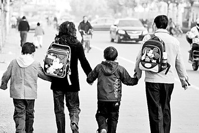 上海某小学附近,很多家长背着沉重的书包送孩子上学,还有家长边走边喂孩子吃东西。李宝洋摄/光明图片