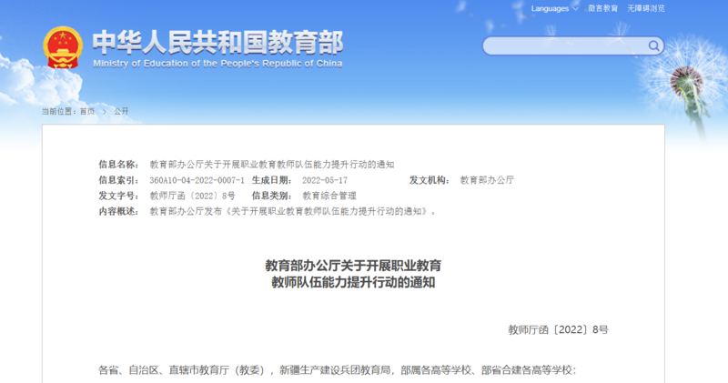 中国青年报客户端北京5月25日电(中青报·中青网见习记者 杨洁)记者今天从教育部官网获悉,为不断加强职业教育教师队伍建设,教育部办公厅发布《关于开展职业教育教师队伍能力提升行动的通知》(以下简称《通知》),决定开展职业教育教师队伍能力提升行动。
