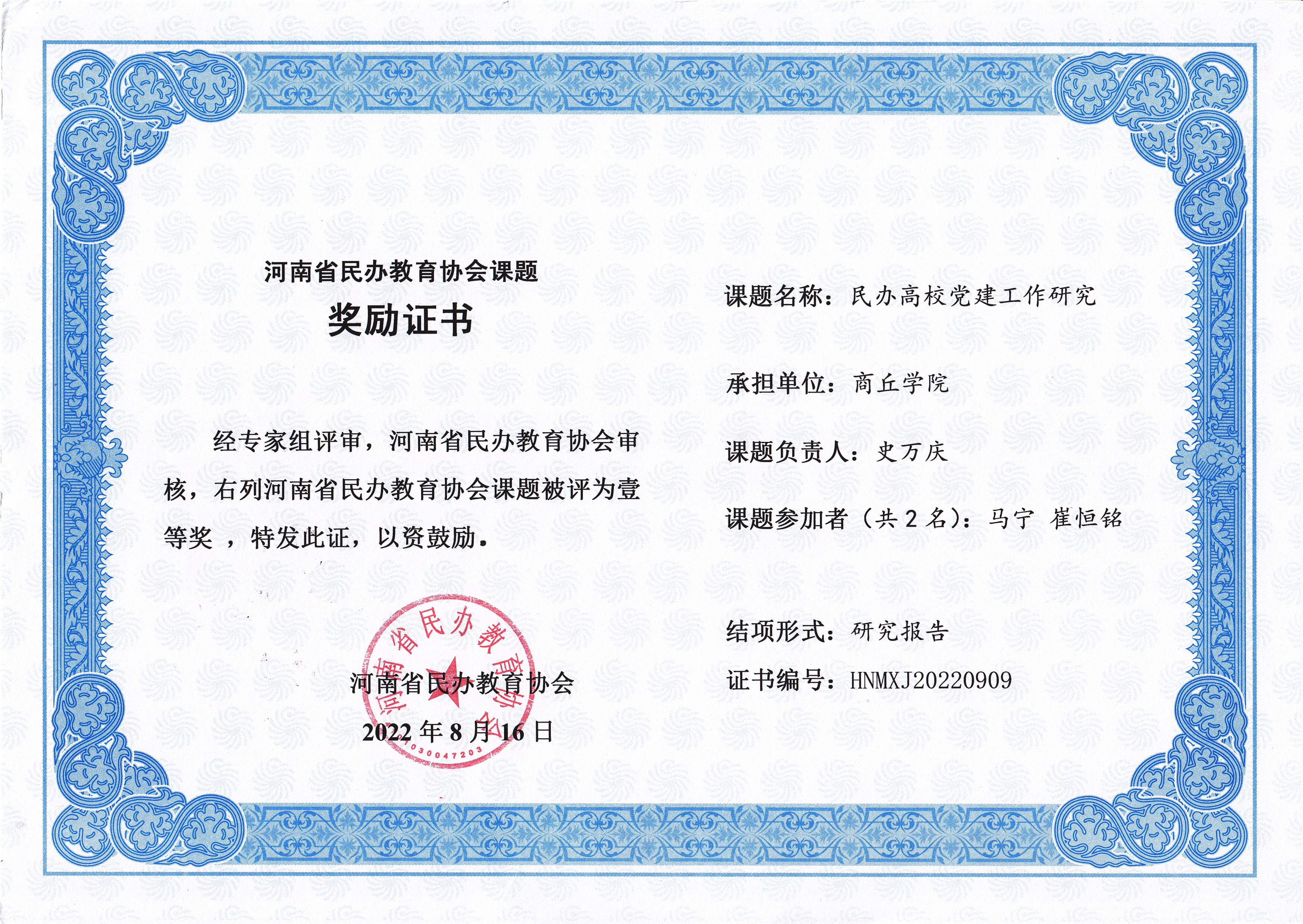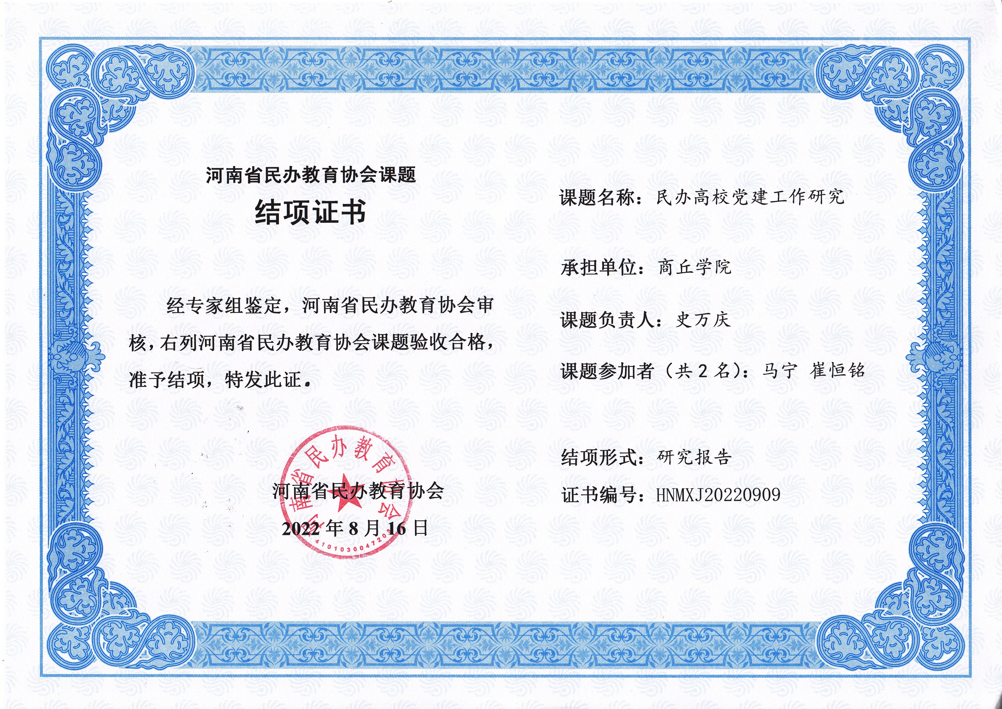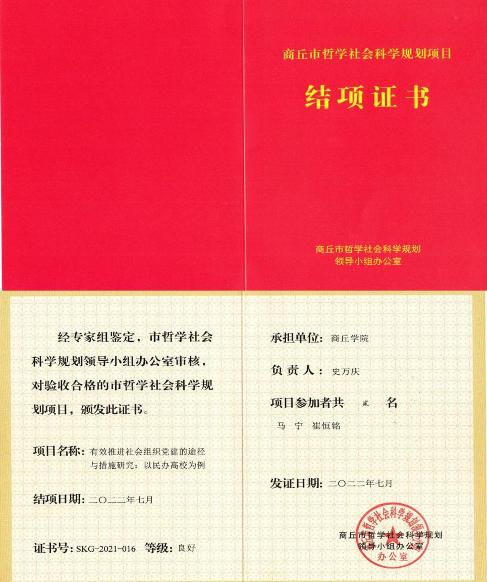 大河网讯 近日,由商丘学院史万庆主持的河南省民办教育协会党建课题《民办高校党建工作研究》获评一等奖。其主持的商丘市哲学社会科学规划课题《有效推进社会组织党建的途径与措施研究:以民办高校为例》经专家组鉴定审核,结项等级良好。