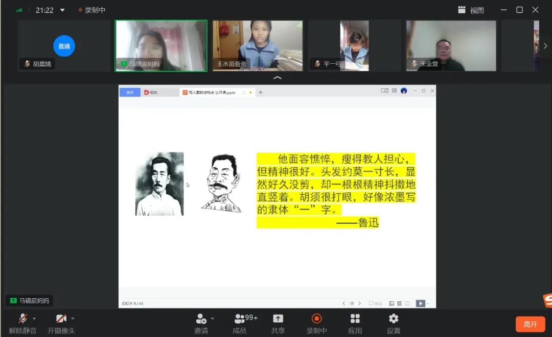 贾利华老师授课的题目是《写人要抓住特点》,看漫画谈感受,赏名作猜人物,学生们在游戏中学到了新知。贾老师紧紧围绕主题,站在开展单元整体教学的角度,紧扣单元语文要素,通过重组单元内的教学内容,对教科书教学、整本书教学和语文实践活动进行了有机的整合,融入了《背影》《从百草园到三味书屋》等多篇课文。特别是将教科书中的口语交际和习作与开展语文实践活动相结合。同时,紧扣本单元语文要素,以“抓住特征描写人物”为关键链,重构单元内容,设计单元整组作业。展开大单元教学活动。整节课创设学习情境,构建表达图式;巧跨学科学习,探寻“五育”融合。