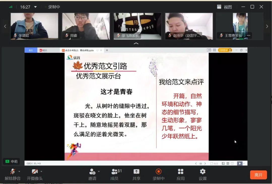 语文组申莉老师带领大家一起走进《直击中考——青春感悟》,课上学生展示了有关青春的手抄报,让我们一同感受到写作的魅力,申老师以自己饱满的情绪、亲切的语言感染并鼓舞着学生,师生合作,将主动权下放于学生,培养了学生的主动性。范文讲解中,引导学生运用不同语气、语调、重音等技巧,读出人物的性格特点,读出情节的起伏变化。整个教学过程中创设情景,让学生入情入景地交流,引导学生在充分交流的基础上展开合理、丰富的想象,拓宽学生的写作思维,使学生在轻松愉快的学习氛围中学习习作的方法。接着进行个性化练笔,引导学生思考问题,有的放矢,颇有成效。整节课互动环节引导自然,侃侃而谈,细节之处,令人触动。