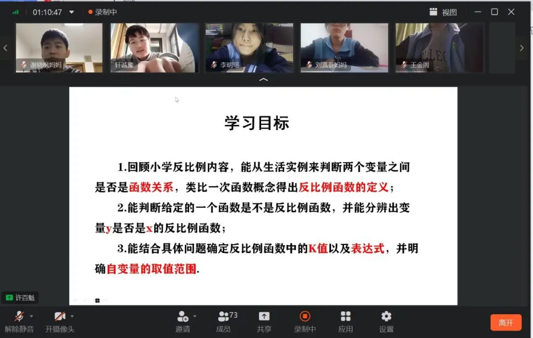 数学组许百魁老师讲授的《反比例函数》这节课,为了使学生牢固掌握解知识,产生学习函数的欲望,许老师设置了新颖的问题情境,联系学校生活让学生从具体的情境中获取信息、学函数,引导尝试主动探究函数的学习,而不是被动地回答老师的问题、接受老师的答案。许老师还联系了物理学科的知识设置问题,与其他学科的交叉融合更能体现学习过程的多元化,培养学生的综合思维方式和综合解决问题的能力,使学生得到全面发展。许老师授课中,采用了新颖的随机点名的方式增加了课堂的趣味性,整节课循序渐进,环环相扣,一步步地引导学生获得新知。
