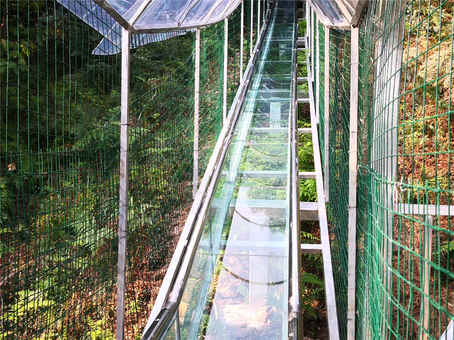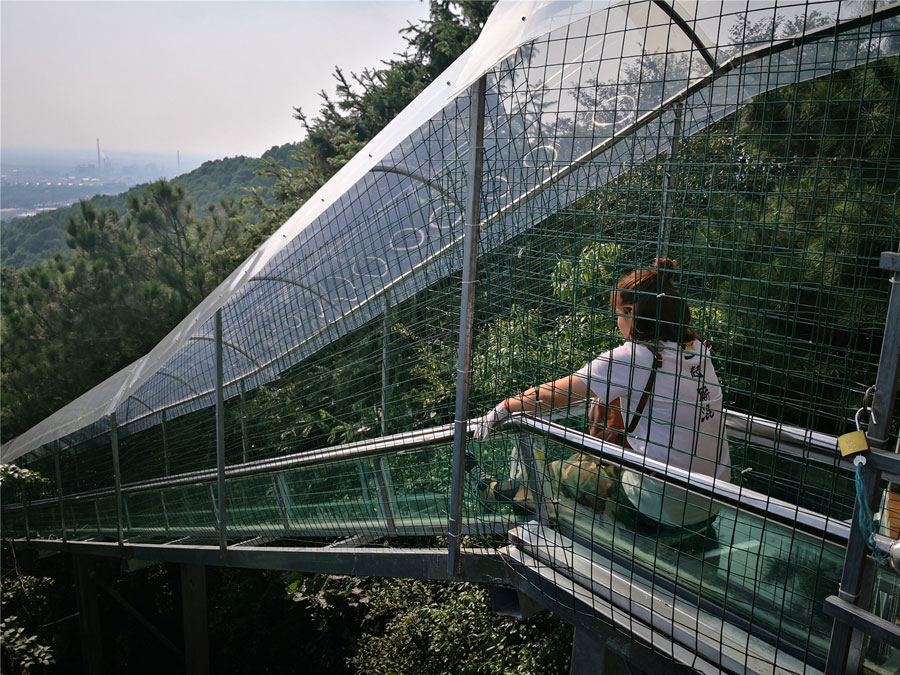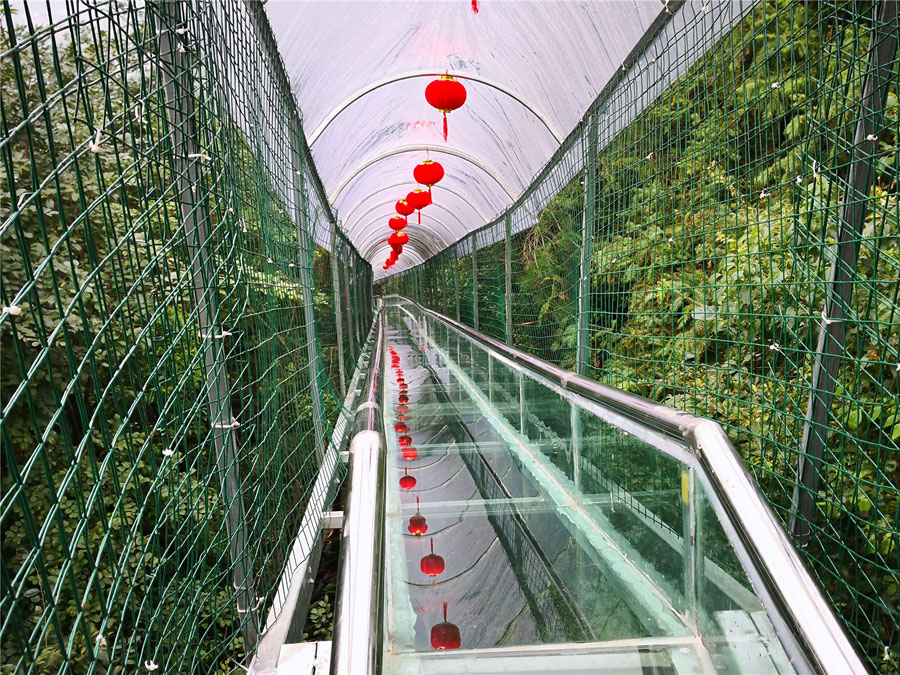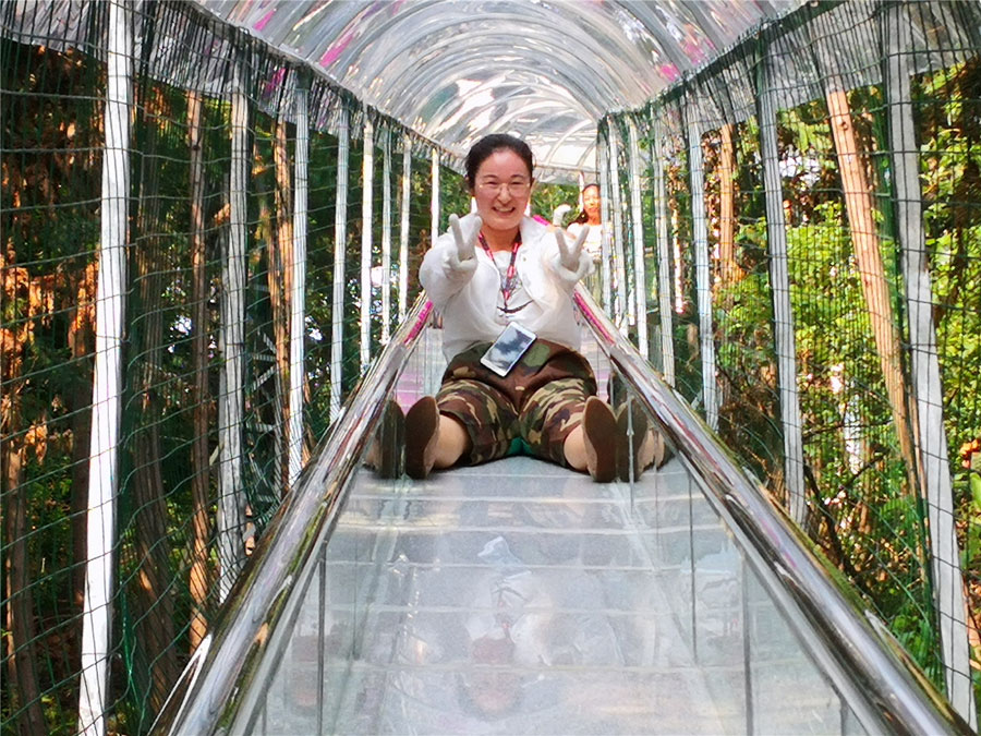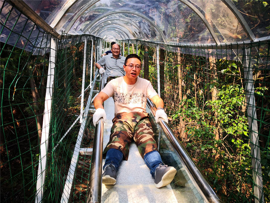 A 388-meter-long slide made of steel and armored glass made its debut last week at a park in Huaxi village, Jiangsu province. The first of its kind in East China, the 158-meter-high slide travels through a forest and allows users to control their speed by holding the handles. [Photo/chinadaily.com.cn]