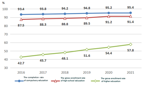Education coverage continues to expand. Since 2016, there has been a continuous rise in the completion rate of compulsory education, the gross enrollment rate of high school education, and the gross enrollment rate of higher education, reaching 95.2 percent, 91.2 percent, and 54.4 percent, respectively, in 2020. Among them, the gross enrollment rate of higher education achieved ahead of time in 2019 the goal of more than 50 percent set in the Plan.
