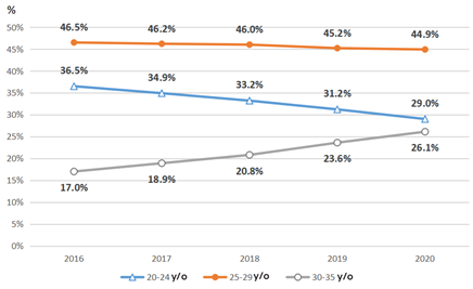 There is a growing trend of late marriage for young people of the right age. The average age of first marriage rose from 26.1 years old in 2016 to 26.8 years old in 2020. Among young people aged 20-35 who have registered to get married, a considerable shift is seen in the proportion of the age group 20-24 and that of the age group 30-35, with the former decreasing from 36.5 percent in 2016 to 29.0 percent in 2020, while the latter increased from 17.0 percent to 26.1 percent.