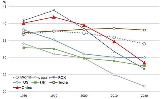 From a worldwide perspective, the proportion of young people in the world population and in some countries[1]has been declining since 1990. Among them, the decline in China, ROK and Japan is faster, and it is slower in the United Kingdom where the proportion is lower. The decline in the United States of America slowed down after 2000. It was after 2010 that India experienced a slow drop.