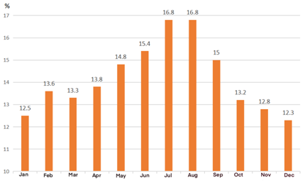 Figure 5 The monthly urban unemployment rate for young people aged 16-24 in 2020