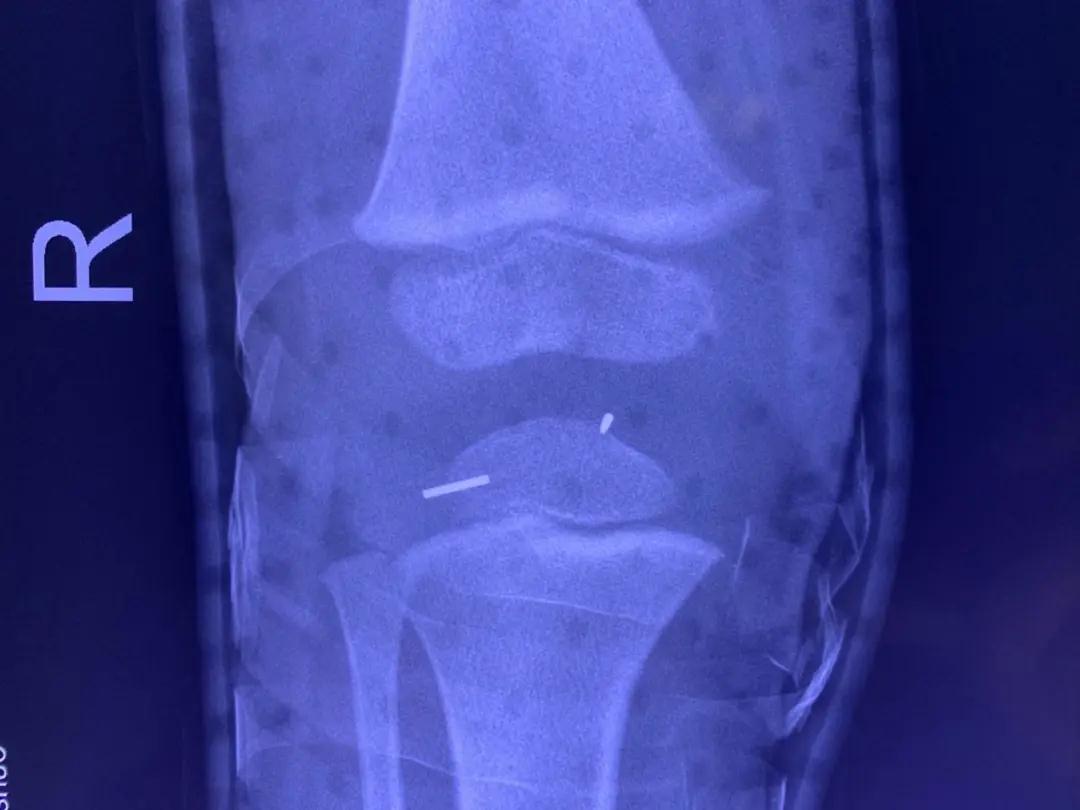 入院后经过检查,发现孩子断在右膝盖中的钢针共有两截,每截大概有1.5厘米,且随着关节运动,钢针位置已经发生偏移。这给手术取出造成了不小困难。该院骨科副主任医师孙克明为晗晗进行急诊手术,在孩子的膝关节囊内,关节腔外角分别将两截断针精准定位并取出。