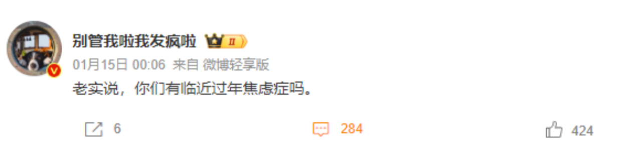 央广网北京2月2日消息(记者 智陈阳)龙年春节将至,渐浓的年味儿、眼前的假期,都让人欢欣鼓舞。然而,有部分人在节前却患上了“焦虑症”,在网络平台上抒发情绪、寻找帮助。在微博平台,一条询问“有没有过年焦虑”的博文吸引了几百条留言和点赞。