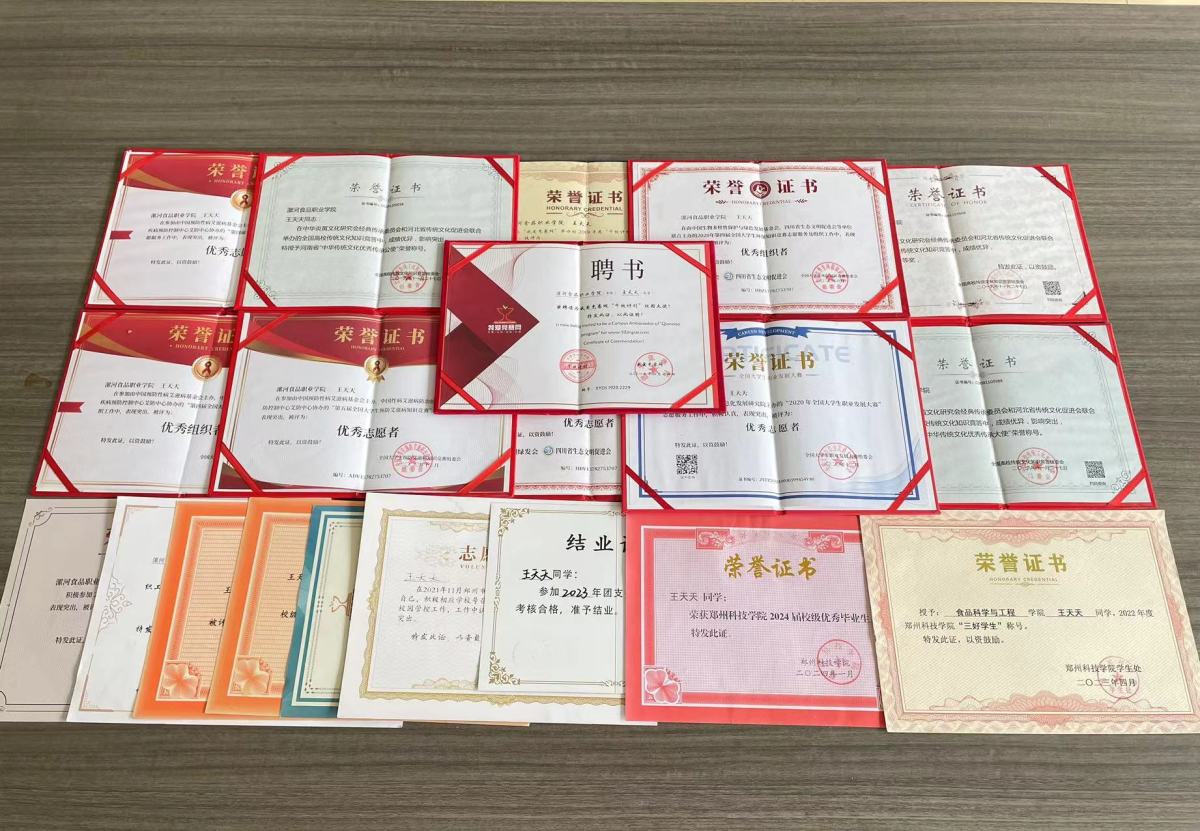 2022年,王天天专科毕业,并成功通过了专升本考试,被郑州科技学院食品科学与工程学院食品质量与安全专业录取,成为一名本科生。本科期间,王天天发愤图强,刻苦学习,主动向老师请教,向优秀的同学学习,积极参加各种活动,在班级担任团支书兼班长,个个能力得到全面锻炼。