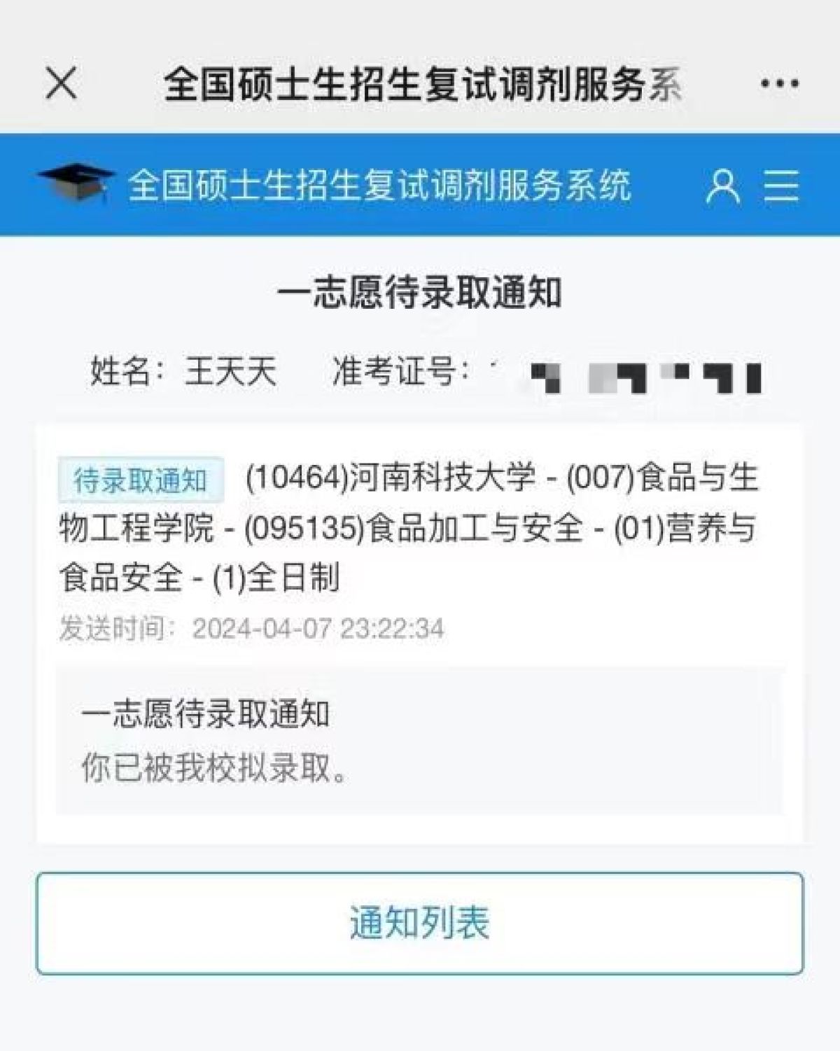 王天天在2017年考上了一所中职学校,2020年考上了一所专科学校。2022年,专升本考上了郑州科技学院食品科学与工程学院。2024年4月,王天天被河南科技大学食品加工与安全专业统招硕士研究生拟录取。