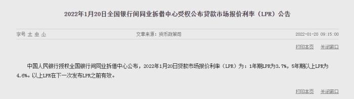 1月20日,全国银行间同业拆借中心公布本月贷款市场报价利率(LPR),1年期LPR为3.7%,比上月下降10个基点;5年期以上LPR为4.6%,比上月下降5个基点。其中,1年期LPR创下连续两个月下行的纪录,5年期以上LPR则是结束了连续20个月的“按兵不动”。