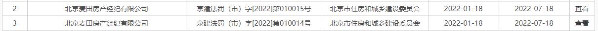 中国经济网北京1月20日讯 近日,北京市住房和城乡建设委员会在同一日发布2份对北京麦田房产经纪有限公司的行政处罚决定书。