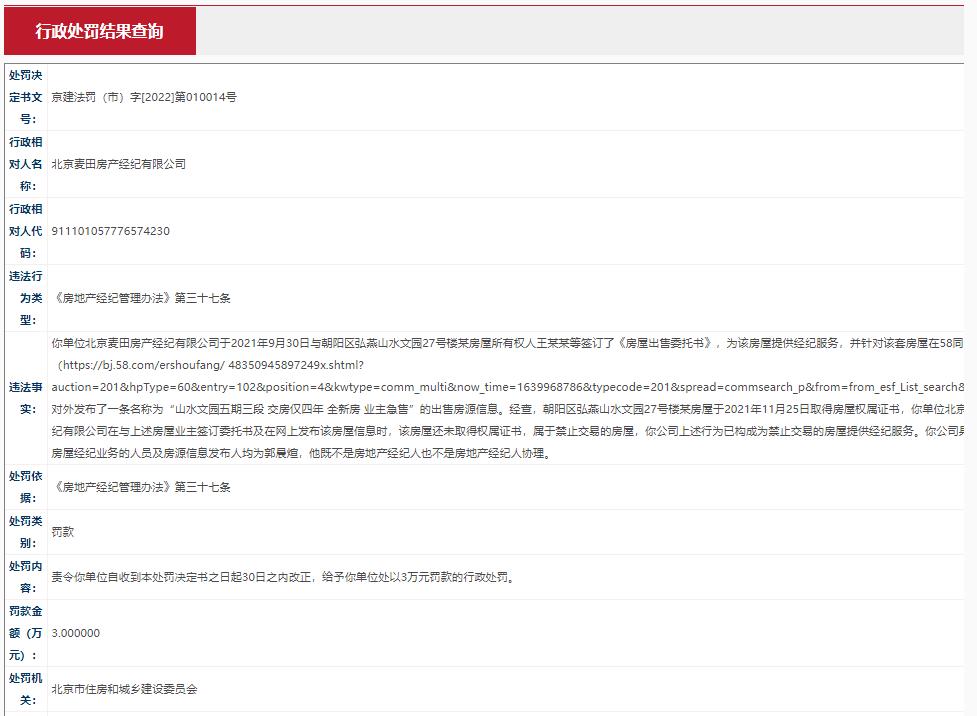 行政处罚决定书(京建法罚(市)字[2022]第010014号)显示,北京麦田房产经纪有限公司于2021年9月30日与朝阳区弘燕山水文园27号楼某房屋所有权人王某某等签订了《房屋出售委托书》,为该房屋提供经纪服务,并针对该套房屋在58同城房产网站对外发布了一条名称为“山水文园五期三段 交房仅四年 全新房 业主急售”的出售房源信息。
