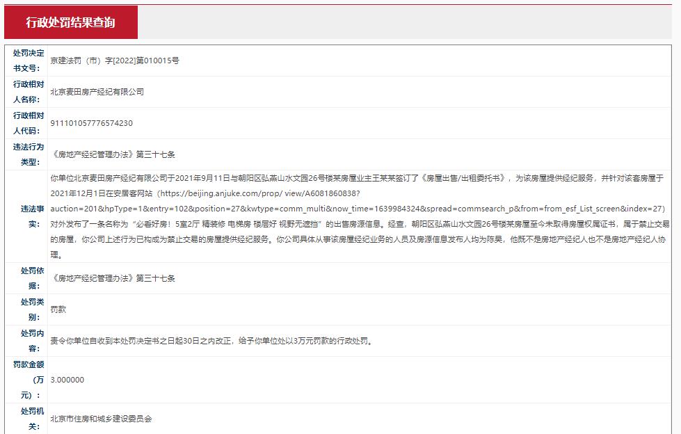 行政处罚决定书(京建法罚(市)字[2022]第010015号)显示,北京麦田房产经纪有限公司于2021年9月11日与朝阳区弘燕山水文园26号楼某房屋业主王某某签订了《房屋出售/出租委托书》,为该房屋提供经纪服务,并针对该套房屋于2021年12月1日在安居客网站对外发布了一条名称为“必看好房!5室2厅 精装修 电梯房 楼层好 视野无遮挡”的出售房源信息。