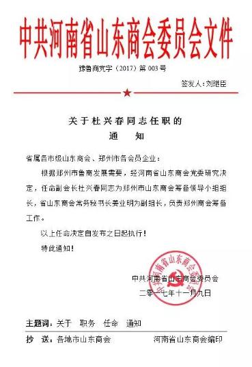 仪式上,河南省山东商会常务副秘书长姜业明宣读并颁发关于杜兴春同志任职郑州市山东商会筹备组的通知文件。