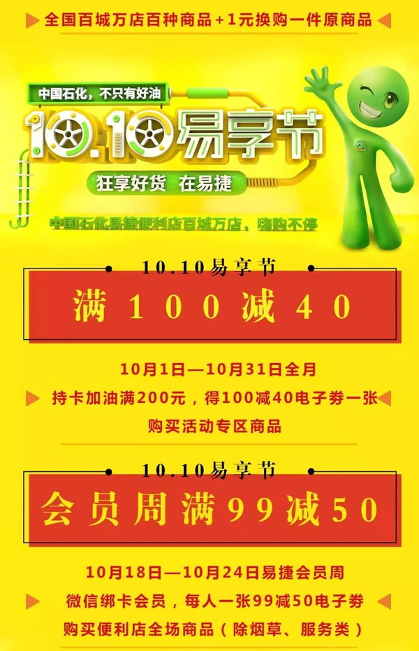 “10·10易享节”系列活动分为三个阶段,10月1日—10月31日为易捷“店庆月”活动,粉丝持卡加油满200元,将获赠100减40电子券,可用于购买活动专区商品;10月10日当天为本次易捷购物节的高潮日——“易享节”,易捷开展百城万店百品同庆暨线下抢购活动,粉丝前往活动便利店所在加油站,加油满100元进店消费,可享受百种商品+1元多一件原品优惠政策(除烟草、服务类商品);10月18日-10月24日为“会员周”,对所有微信绑卡会员主动推送一张99减50满减券,用于购买便利店全场商品(除烟草、服务类商品)。