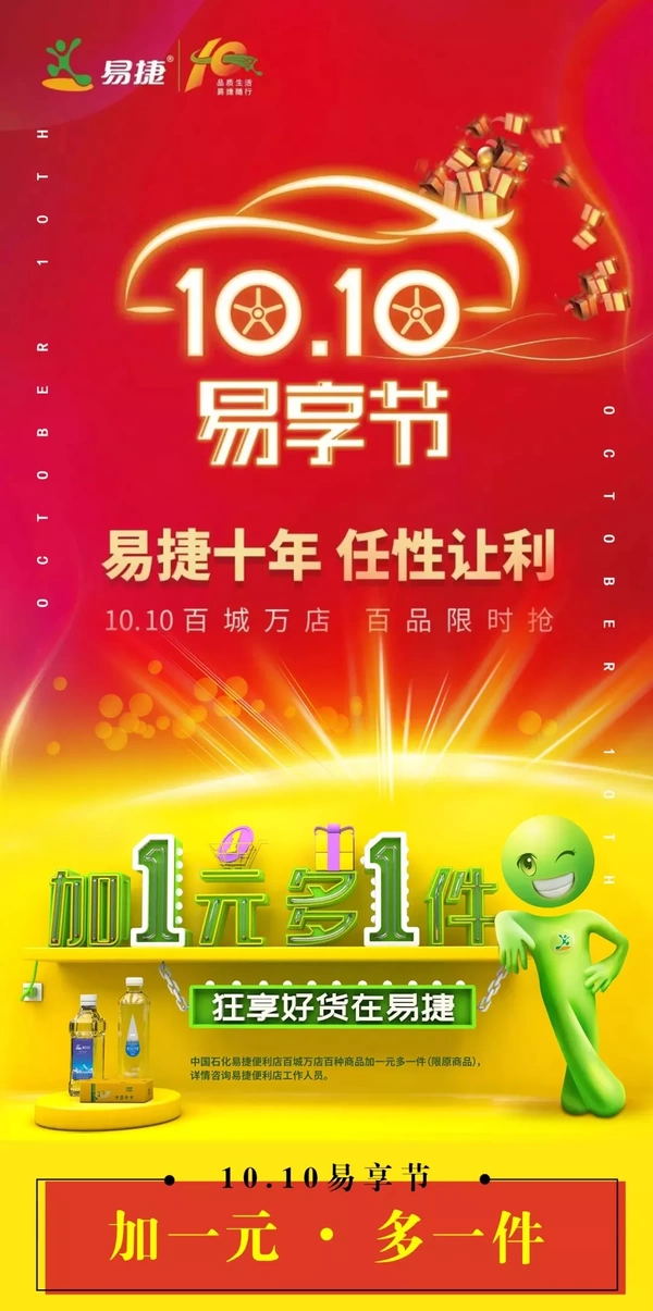 金秋十月,中石化易捷任性让利,将在全国范围内的加油站易捷店,开展主题为“10·10易享节”的系列购物优惠活动。100减40、加1元多一件、99减50……连续不断的易捷优惠活动,让车友狂欢嗨购,便利享受低价好货。