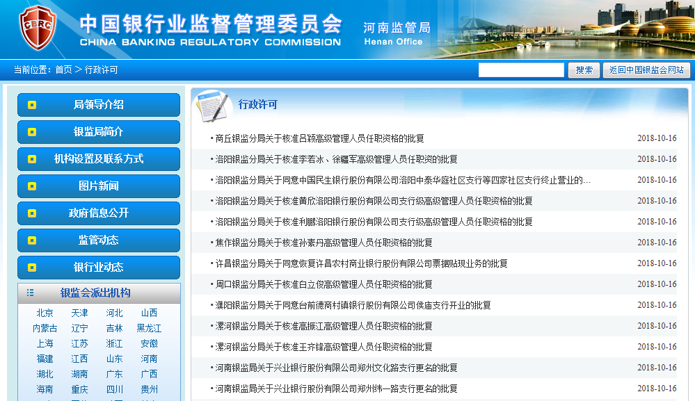 大河网讯(记者 申久燕)10月16日,河南银监局官网接连发布13则批复,经审查,9名银行高管任职资格被核准,民生银行4家支行获批终止营业,一家村镇银行支行获批开业,兴业银行两家支行获批更名。此外,河南银监局还同意一家农商行恢复票据贴现业务。