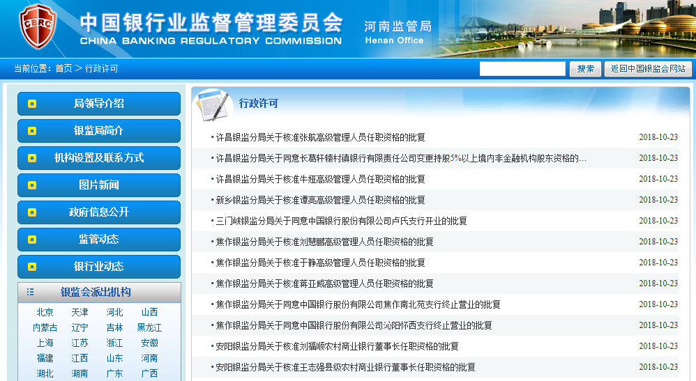 大河网讯 10月23日,河南银监局发布12则行政许可批复,经审查,8名银行董事长、行长任职资格获批,中国银行2家支行获批终止营业。此外,中国银行卢氏支行获批开业,1家村镇银行变更持股股东资格。