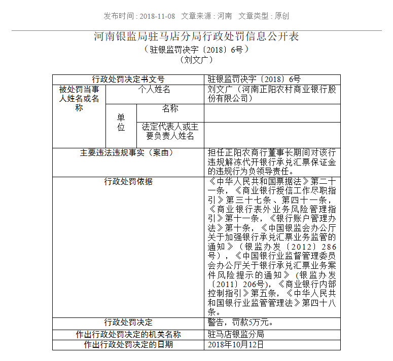 该行政处罚决定文书显示,刘文广违反了《中华人民共和国票据法》第二十一条,《商业银行授信工作尽职指引》第三十七条、第四十一条,《商业银行表外业务风险管理指引》第十一条,《银行账户管理办法》第十条,《中国银监会办公厅关于加强银行承兑汇票业务监管的通知》(银监办发〔2012〕286号),《中国银行业监督管理委员会办公厅关于银行承兑汇票业务案件风险提示的通知》(银监办发〔2011〕206号),《商业银行内部控制指引》第五条,《中华人民共和国银行业监管管理法》第四十八条,被驻马店银监分局警告并处罚款5万元。