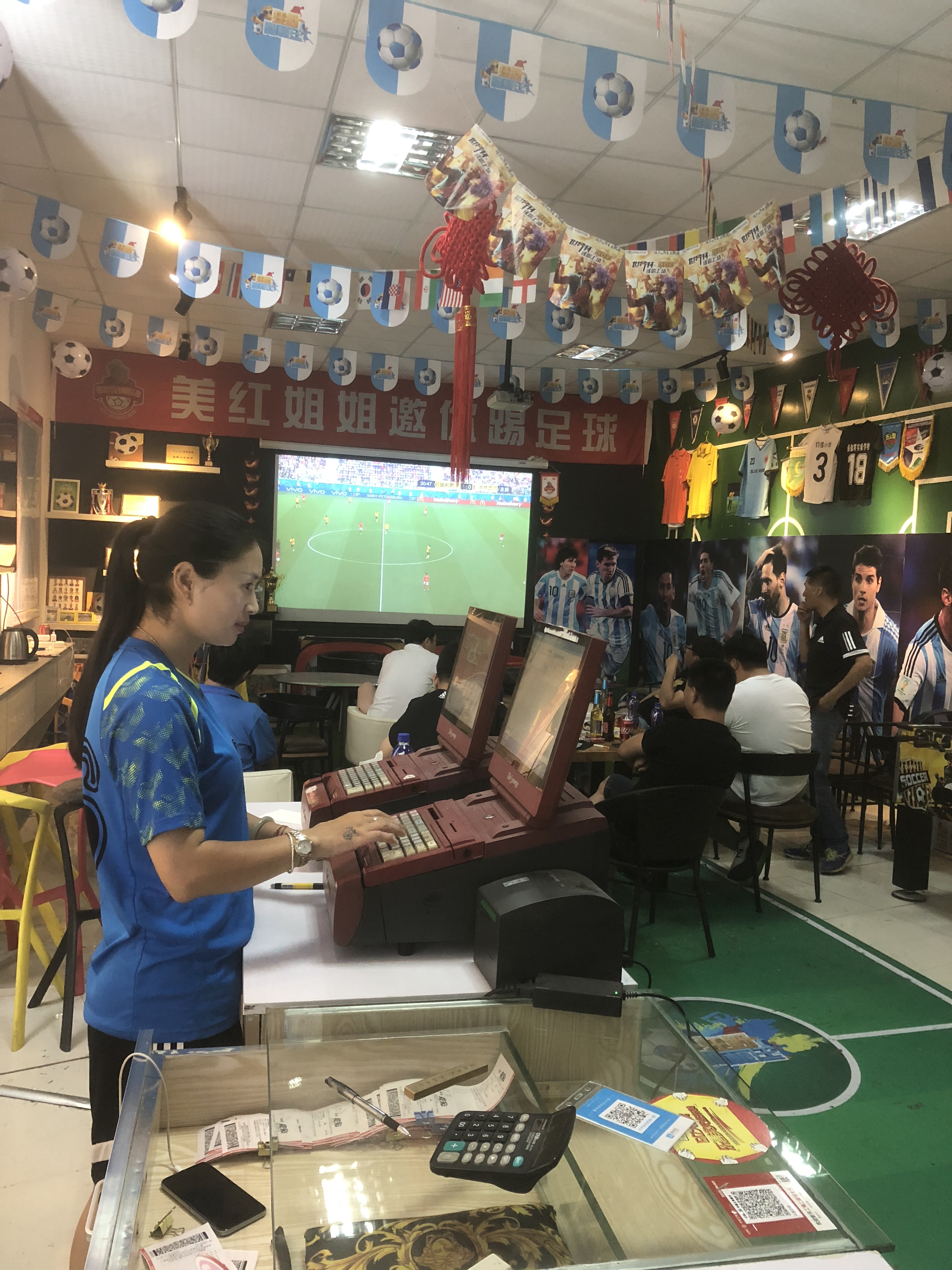 不一般的业主打造出不一般的体彩网点。地面上的足球场贴图、墙上球星梅西的喷绘、悬挂着的球衣和旗帜、“美红姐姐邀你看球”的标语,与正在直播的赛事、几个聚在这里看球的球友,网点里充满着足球元素。“这更像一个足球俱乐部”,来到这里的购彩者如此评价说。足球元素搭配着醒目的中国体育彩票logo,看起来分外和谐,正如在“美红姐姐”身上,足球人和体彩人两者身份完美地结合。